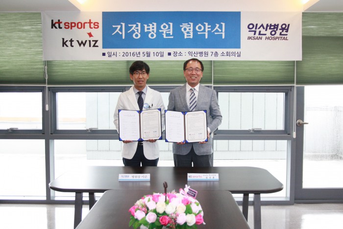 익산병원은 kt와의 협약을 통해 kt 퓨처스리그 구급차 지원, 응급조치를 포함해 선수단의 건강 관리와 부상 방지, 재활 치료 등을 지원한다. 또 선수단과 임직원, 직계 가족 건강 검진과 진료 혜택도 제공한다.프로야구 kt가 10일 전북 익산병원과 지정병원 협약을 체결했다. 김진훈 kt 단장(오른쪽)과 이준 익산병원 원장이 협약서를 들고 기념촬영하고 있다. <사진제공=kt 위즈>