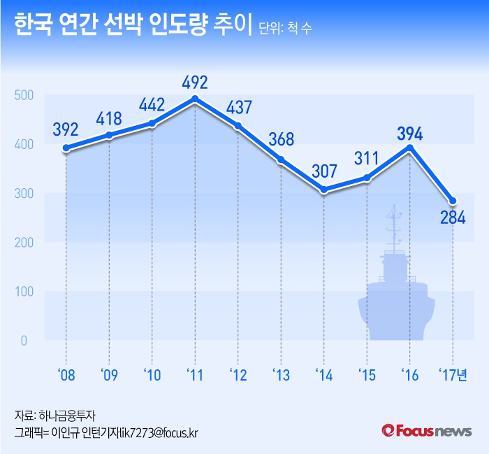 (서울=포커스뉴스) 8일 하나금융투자가 발표한 자료에 따르면 한국 조선업의 연간 선박 인도량은 지난 5년간 연평균 373척이었다.