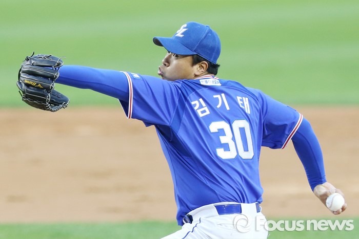 (서울=포커스뉴스) 10일 서울 잠실구장에서 열린 2016 프로야구 삼성-LG 경기에서 1회말 삼성 선발투수 김기태가 투구하고 있다.