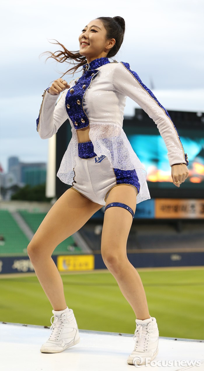 (서울=포커스뉴스) 10일 서울 잠실구장에서 열린 2016 프로야구 삼성-LG 경기에서 삼성 치어리더가 승리를 부르는 손짓으로 관중들의 응원을 유도하고 있다.