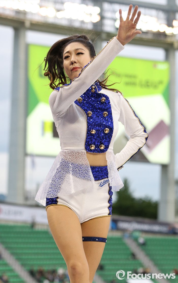 (서울=포커스뉴스) 10일 서울 잠실구장에서 열린 2016 프로야구 삼성-LG 경기에서 삼성 치어리더가 승리를 부르는 손짓으로 관중들의 응원을 유도하고 있다.