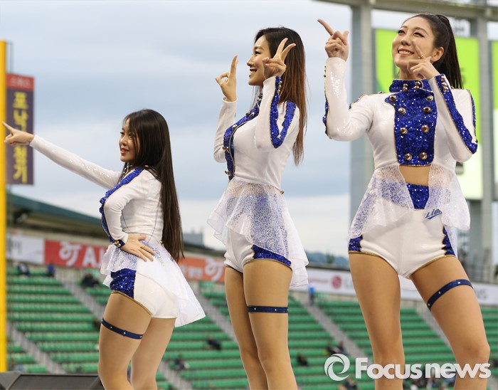 (서울=포커스뉴스) 10일 서울 잠실구장에서 열린 2016 프로야구 삼성-LG 경기에서 삼성 치어리더가 승리를 부르는 손짓으로 관중들의 응원을 유도하고 있다.