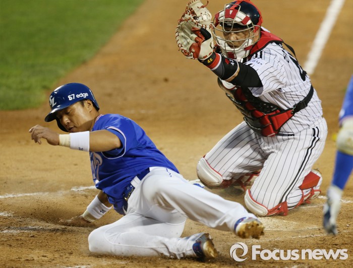 (서울=포커스뉴스) 10일 서울 잠실구장에서 열린 2016 프로야구 삼성-LG 경기 3회초 2사 1,2루에서 삼성 이지영의 중전 적시타때 2루주자 이승엽이 홈에서 세이프되고 있다.