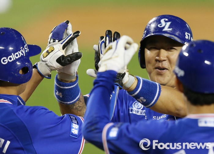 (서울=포커스뉴스) 10일 서울 잠실구장에서 열린 2016 프로야구 삼성-LG 경기 8회초 1사 1,2루에서 삼성 최형우가 우월 3점 홈런을 치고 선행주자의 환영을 받으며 홈인하고 있다.