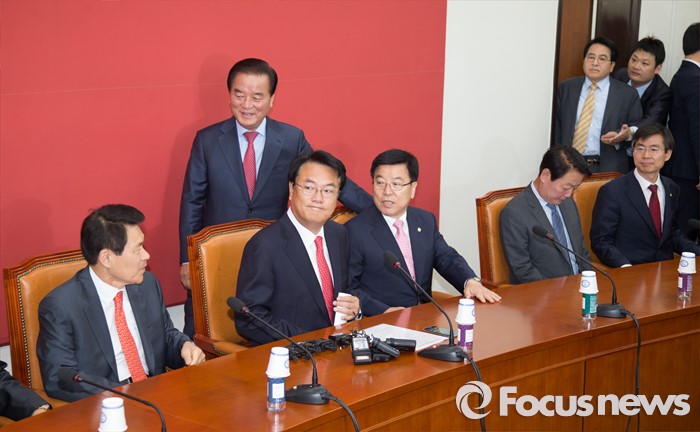 (서울=포커스뉴스) 11일 오전 서울 여의도 국회에서 열린 새누리당 원내지도부-중진의원 연석회의에 의원들이 참석하고 있다. 왼쪽부터 이군현, 정갑윤 의원, 정진석 원내대표, 김광림 정책위의장, 한선교, 심재철, 조경태 의원.