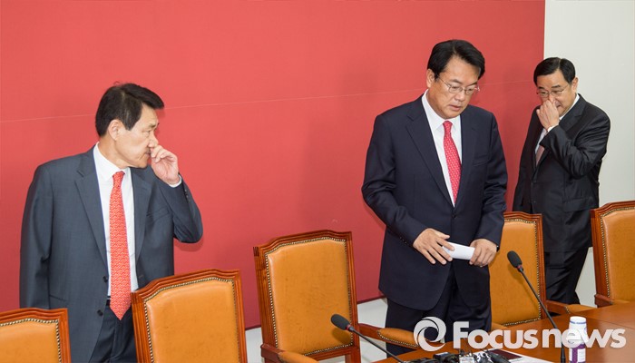 (서울=포커스뉴스) 정진석(가운데) 새누리당 원내대표가 중진 의원들과 함께 11일 오전 서울 여의도 국회에서 원내지도부 중진의원 연석회의에 참석하고 있다. 왼쪽부터 이군현 의원, 정 원내대표, 김정훈 의원