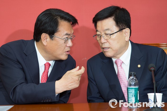 (서울=포커스뉴스) 정진석(왼쪽) 새누리당 원내대표와 김광림 정책위의장이 11일 오전 서울 여의도 국회에서 원내지도부 중진의원 연석회의에 참석해 대화하고 있다.