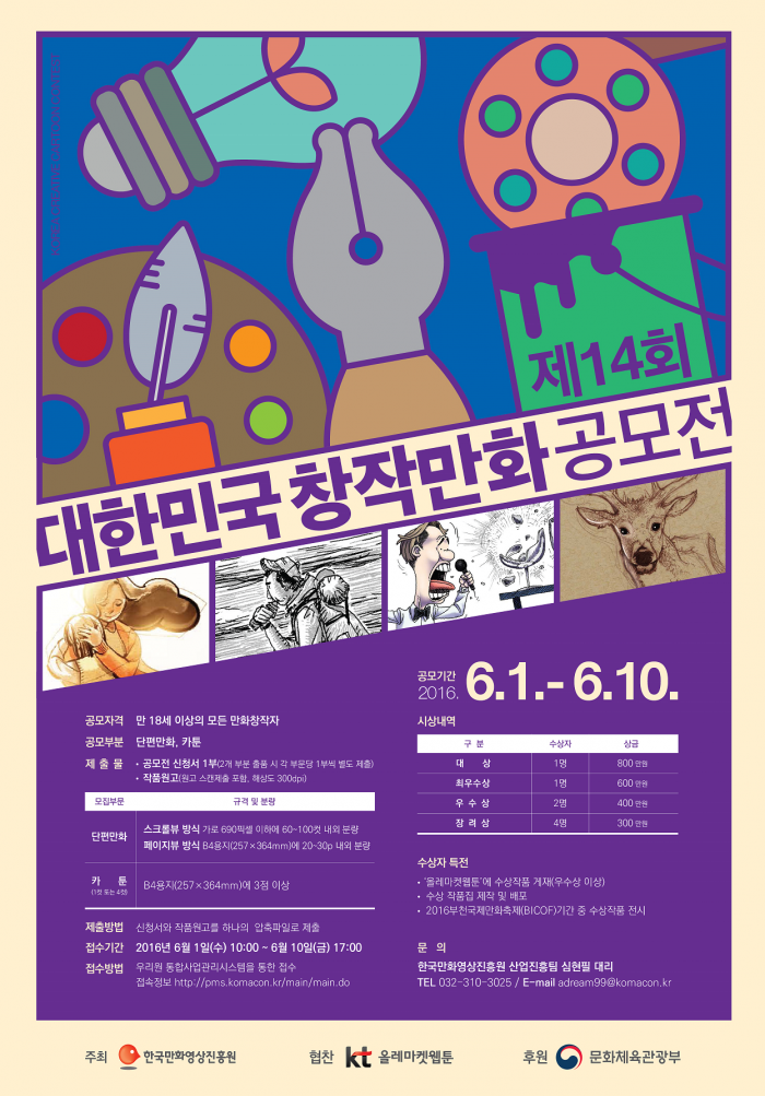 '대한민국 창작만화 공모전'은 만화가의 창작력 고양과 한국만화시장 활성화를 위해 개최됐으며 올해로 14회째를 맞은 창작만화공모전이다. 만 18세 이상이면 누구나 참여 가능하며, 단편만화와 카툰 2가지 부문으로 진행된다. 대상에게 주어지는 문화체육관광부장관상 및 시상금 800만원을 비롯해 총 8명에게 3400만원의 상금이 지급된다.