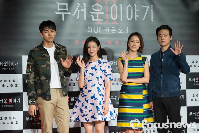 '무서운 이야기3: 화성에서 온 소녀'는 오는 6월 2일 개봉해 관객과 만날 예정이다.(서울=포커스뉴스) 11일 오전 서울 광진구 롯데시네마 건대입구점에서 열린 영화 '무서운이야기3' 제작보고회에 참석한 배우 임슬옹(왼쪽부터), 경수진, 홍은희, 박정민이 포토타임을 갖고 있다. 2016.05.11 김유근 기자 (서울=포커스뉴스) 11일 오전 서울 광진구 롯데시네마 건대입구점에서 열린 영화 '무서운이야기3' 제작보고회에 참석한 배우 박정민(왼쪽 세번째)이 진행자의 질문에 답하고 있다. 왼쪽부터 배우 임슬옹, 경수진, 박정민, 홍은희. 2016.05.11 김유근 기자 홍은희, 박정민, 경수진, 임슬옹 등이 열연한 영화 '무서운 이야기3: 화성에서 온 소녀' 메인 포스터. <사진제공=수필름,롯데엔터테인먼트>