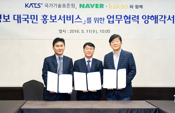 (서울=포커스뉴스) 이승우 산업통상자원부 국가기술표준원 제품안전정책국장이 11일 오전 서울 팔래스호텔 제이드홀에서 리콜정보의 대국민 알림서비스 강화’를 위해 산업부 국가기술표준원과 네이버 및 카카오간 '리콜정보 대국민 홍보 협력'을 위한 업무협약 체결식을 갖고 기념촬영 하고 있다. 왼쪽부터 공기중 네이버 이사, 이승우 국기기술표준원 제품안전정책국장, 이병선 카카오 부사장. <사진제공=산업통상자원부>