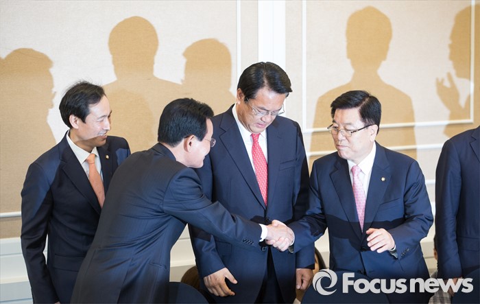 (서울=포커스뉴스) 11일 오후 서울 여의도 국회 귀빈식당에서 열린 3당 원내지도부 회동에 참석한 의원들이 인사하고 있다. 왼쪽부터 우상호 더불어민주당 원내대표, 변재일 정책위의장, 정진석 새누리당 원내대표, 김광림 정책위의장.