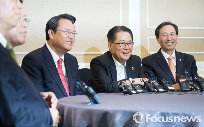 (서울=포커스뉴스) 3당 원내대표가 11일 오후 서울 여의도 국회 귀빈식당에서 열린 회동에 참석해 미소 짓고 있다. 오른쪽부터 우상호 더불어민주당 원내대표, 박지원 국민의당 원내대표, 정진석 새누리당 원내대표.