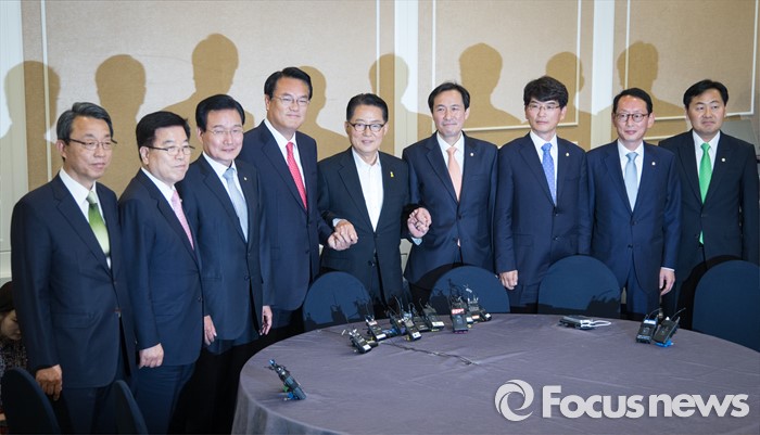 (서울=포커스뉴스) 11일 오후 서울 여의도 국회 귀빈식당에서 열린 3당 원내지도부 회동에 참석한 의원들이 취재진을 향해 포즈를 취하고 있다. 왼쪽부터 김성식 국민의당 정책위의장, 김광림 새누리당 정책위의장, 변재일 더불어민주당 정책위의장, 정진석 새누리당 원내대표, 박지원 국민의당 원내대표, 우상호 더불어민주당 원내대표, 박완주 원내수석부대표, 김도읍 새누리당 원내수석부대표, 김관영 국민의당 원내수석부대표.