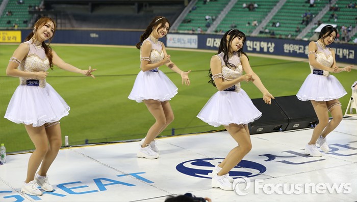 (서울=포커스뉴스) 11일 서울 잠실구장에서 열린 2016 프로야구 삼성-LG 경기에서 LG 치어리더가 순백의 짧은 치마를 입고 정열적인 안무로 관중들의 시선을 모으고 있다.