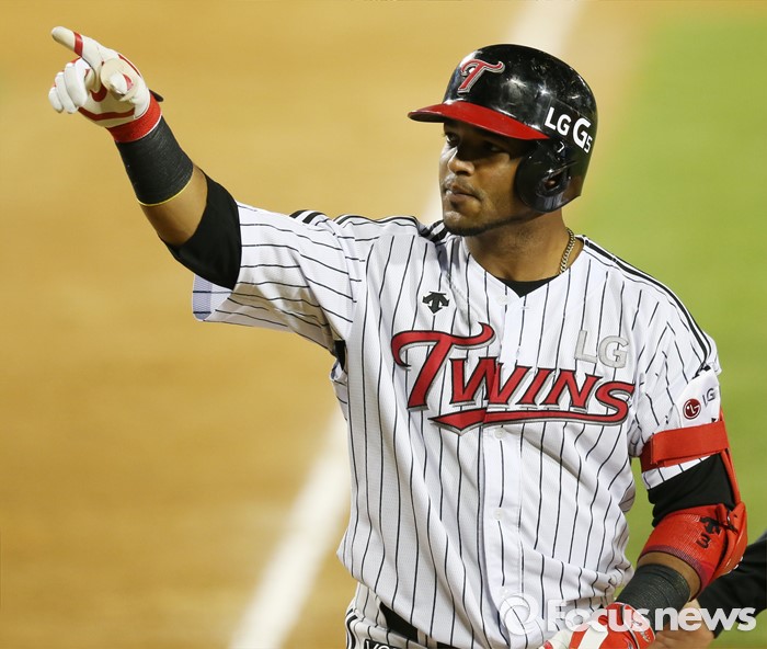 (서울=포커스뉴스) 11일 서울 잠실구장에서 열린 2016 프로야구 삼성-LG 경기 5회말 LG 히메네스가 시즌 10호 좌월 솔로 홈런을 치고 중앙 관중석을 가리키며 홈인하고 있다.