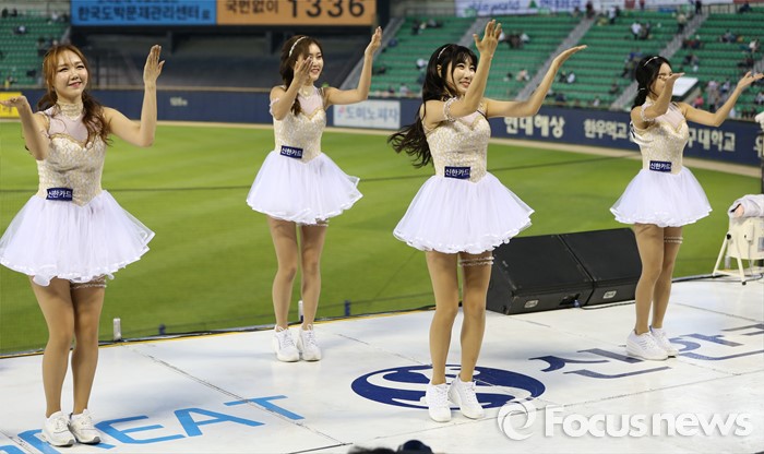 (서울=포커스뉴스) 11일 서울 잠실구장에서 열린 2016 프로야구 삼성-LG 경기에서 LG 치어리더가 순백의 짧은 치마를 입고 정열적인 안무로 관중들의 시선을 모으고 있다.
