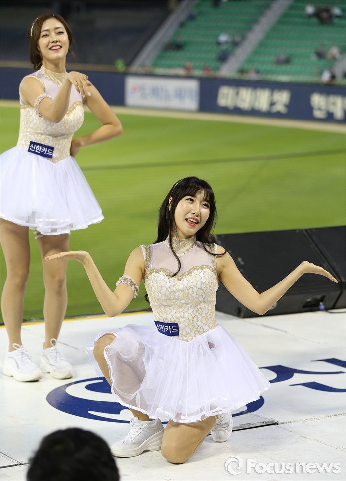 (서울=포커스뉴스) 11일 서울 잠실구장에서 열린 2016 프로야구 삼성-LG 경기에서 LG 치어리더가 순백의 짧은 치마를 입고 정열적인 안무로 관중들의 시선을 모으고 있다.