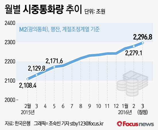 (서울=포커스뉴스) 한국은행이 12일 낸 ‘2016년 3월중 통화 및 유동성 동향’에 따르면 지난달 시중통화량(M2·광의통화)은 전년 동월 대비 7.8%, 전월 대비 0.8% 증가한 2296조8000억원(계절조정·평잔)으로 집계됐다.