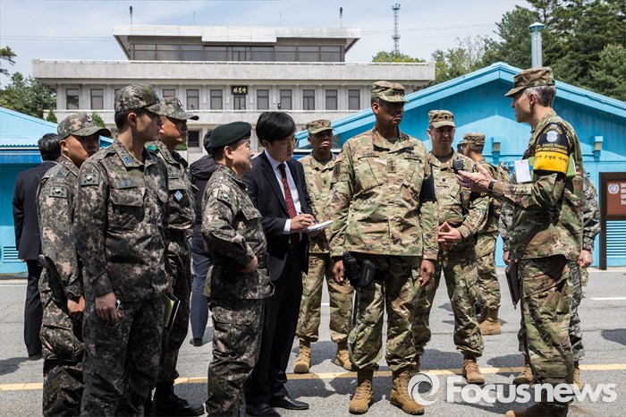 (파주=포커스뉴스) 빈센트 브룩스 신임 한·미연합사령관 겸 주한미군사령관과 이순진 합참의장이 12일 오후 경기도 파주시 판문점 공동경비구역(JSA)을 방문, 관계자로부터 설명을 듣고 있다.