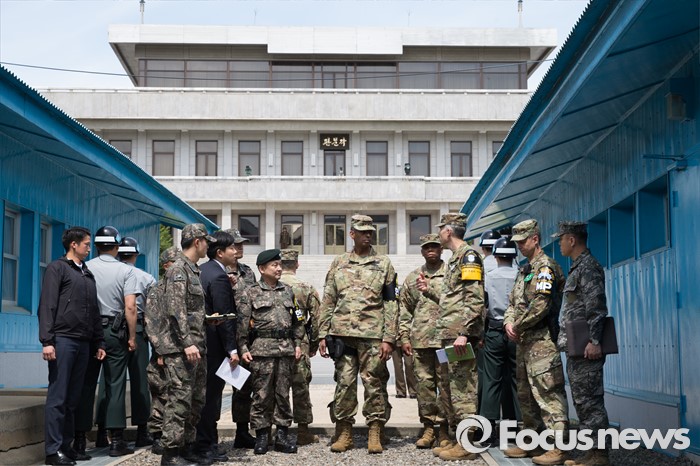 (파주=포커스뉴스) 빈센트 브룩스(오른쪽 다섯번째) 신임 한·미연합사령관 겸 주한미군사령관과 이순진(오른쪽 여섯번째) 합참의장이 12일 오후 경기도 파주시 판문점 공동경비구역(JSA)을 방문, 관계자로부터 설명을 듣고 있다.