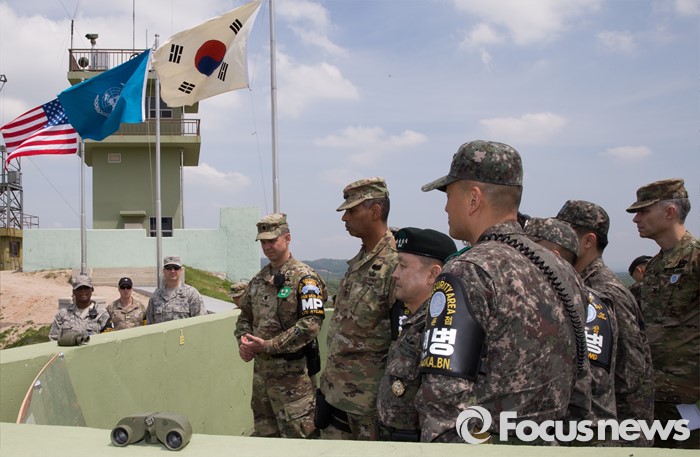 (파주=포커스뉴스) 빈센트 브룩스(앞줄 왼쪽 두번째) 신임 한·미연합사령관 겸 주한미군사령관과 이순진(앞줄 오른쪽 두번째) 합참의장이 12일 오후 경기도 파주시 JSA(공동경비구역)를 방문, 오울렛 초소에서 관계자로부터 설명을 듣고 있다.