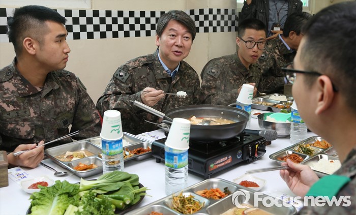 (연천=포커스뉴스) 안철수(왼쪽 두번째) 국민의당 상임공동대표가 12일 오후 경기도 연천 전방부대를 방문해 장병들과 오찬을 하고 있다.