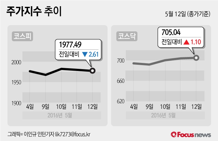 (서울=포커스뉴스) 12일 코스피지수는 전날 보다 0.13%(2.61포인트) 내린 1977.49에 장을 마쳤다. 코스닥지수는 전일 대비 0.16%(1.10포인트) 오른 705.04에 마감했다.