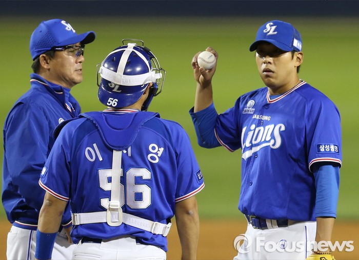 (서울=포커스뉴스) 12일 서울 잠실구장에서 열린 2016 프로야구 삼성-LG 경기 5회말 삼성 투수 윤성환이 연속 안타를 맞자 김태한 투수코치가 마운드에 올라가 집중력을 주문하고 있다.