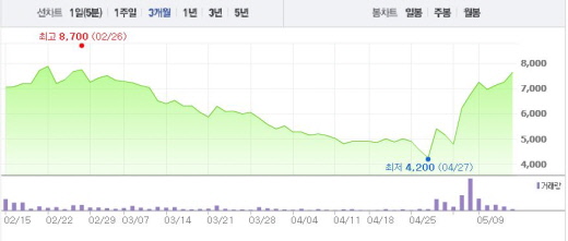 알 왈리드 왕자의 킹덤홀딩컴퍼니(Kingdom Holding Company)와 함께 추진하고 있는 사우디 ‘제다 프로젝트’는 물론, 사우디 정부가 석유 의존형의 경제 구조를 새로운 산업 구조로 개조하기 위해 추진하는 ‘사우디 비전2030’에 썬코어와 케이티롤이 공동 참여할 예정이다.썬코어 주가흐름<사진출처=네이버 캡쳐>