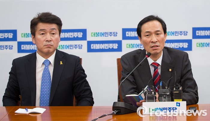 (서울=포커스뉴스) 우상호(오른쪽) 더불어민주당 원내대표가 13일 오후 서울 여의도 국회에서 '박근혜 대통령과 여야 3당 원내지도부 회동' 결과에 대해 브리핑하고 있다.