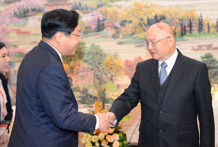 (서울=포커스뉴스) 주형환 산업통상자원부 장관 13일 중국 시안 취장 국제전시센터 귀빈실에서 진원 중국 전국정협 부주석과 면담에 앞서 악수를 하고 있다. <사진제공=산업통상자원부>