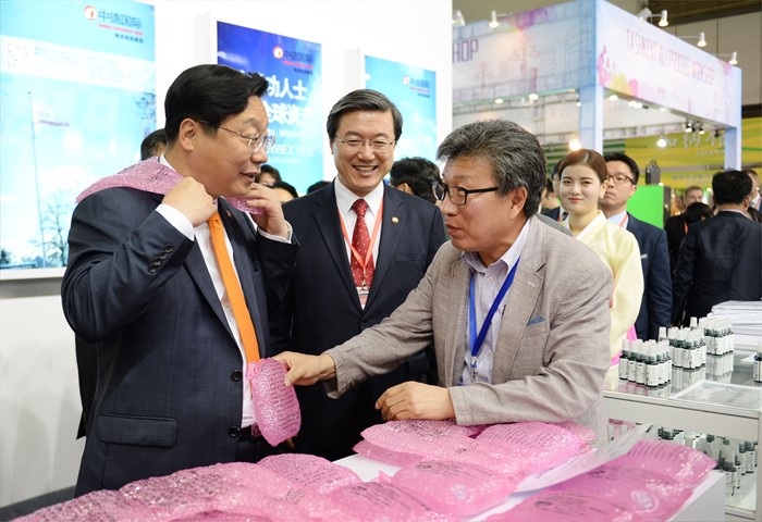 (서울=포커스뉴스) 주형환 산업통상자원부 장관이13일 중국 시안 취장국제전시센터 A홀에서 시안 실크로드박람회 주빈국 참여로 농식품, 생활용품, 의류, 화장품, 의약품 등 5대 소비재 품목의 소비재기업관, SM 융합상품관, 한국식품관(aT), K-HIT관, VR체험관(삼성전자), FTA홍보관 등 기업부스 50개사, 단체부스 50개사가 참여한 가운데 열린 ‘실크로드박람회’「국가홍보관(한국관)」개막식에 참석하여, 한국제품 전시장을 둘러보고 있다. <사진제공=산업통상자원부>