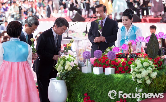 (서울=포커스뉴스) 14일 오전 서울 종로구 조계사 대웅전에서 열린 불기 2560년 부처님 오신날 봉축 법요식에서 안철수 국민의당 상임공동대표와 천정배 공동대표가 헌화하고 있다.