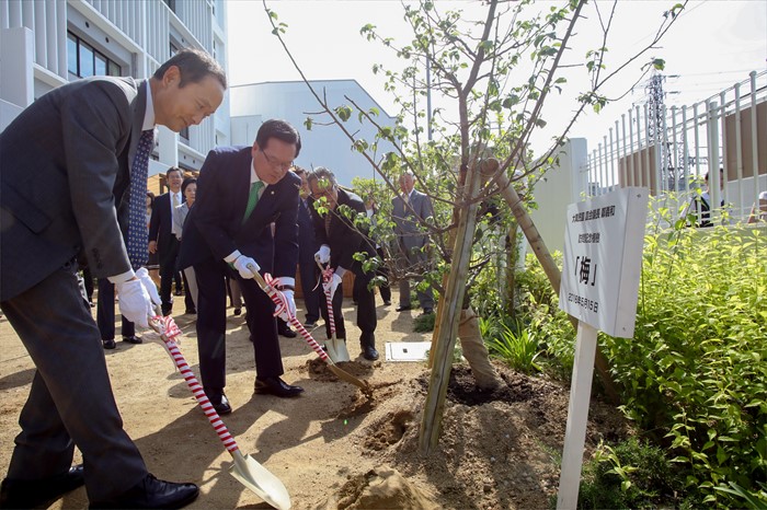 (서울=포커스뉴스) 일본을 방문 중인 정의화(왼쪽 두번째) 국회의장이 15일 오전 오사카 소재 민족학교인 건국학교를 방문해 관계자들과 개교 70주년 기념식수를 하고 있다. <사진제공=국회>