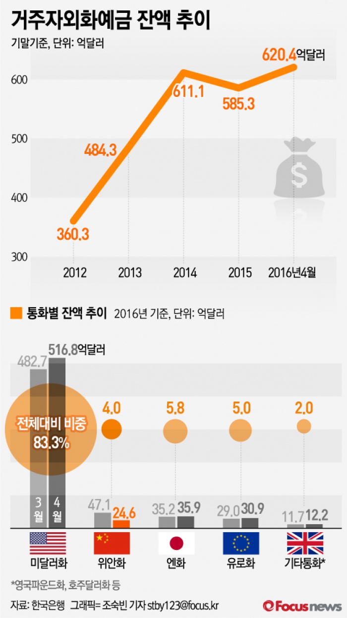 (서울=포커스뉴스) 한국은행이 16일 발표한 ‘2016년 4월말 거주자외화예금 현황’에 따르면 지난달 말 기준 외국환은행의 거주자외화예금은 620억4000만달러로 전월 대비 14억7000만달러 늘었다.