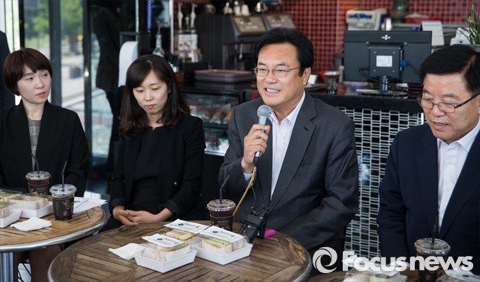 (서울=포커스뉴스) 정진석(오른쪽 두번째) 새누리당 원내대표와 김광림(오른쪽) 정책위의장이 16일 오후 서울 여의도 한강공원의 한 카페에서 여성 당직자들과 '3040여성당직자 브라운백 미팅'을 갖고 있다.