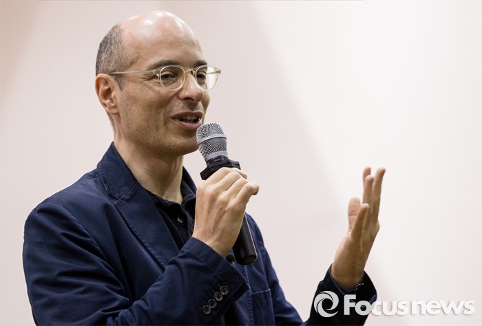 (서울=포커스뉴스) 16일 오후 서울 종로구 서울예술고등학교를 찾은 프랑스 작가 베르나르 베르베르가 '오늘날의 예술적 지능'이란 주제로 학생들에게 강연하고 있다.
