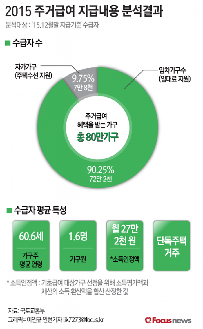 (서울=포커스뉴스)16일 국토교통부가 발표한 자료에 따르면 2015년 7월부터 개편된 주거급여 제도 시행 이후 수혜가구가 80만가구로 집계됐다. 주거급여 수급가구는 평균 60.6세의 가구주가 1.6명의 가구를 구성하는 것으로 파악됐다. 소득인정액은 월 27만2000원 수준으로 주로 단독주택에 거주했다.
