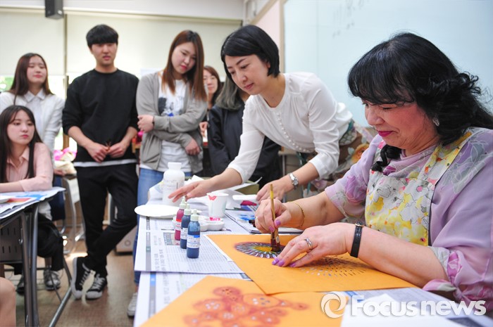 (서울=포커스뉴스) 지난 16일 오후 서울 광진구 능동로 건국대학교 사범대학 일본어교육과에서 열린‘일본 전통 염색의 이해와 체험' 특강에서 일본 돗토리현(鳥取縣)의 전통 공예사 가와하라 가나요(오른쪽, 川原かなよ)씨가 돗토리현의 향토 공예품인 '다이센 유젠조메(大山友禅染)'를 학생들에게 선보이고 있다. 건국대 사범대학 일어교육과와 교육대학원 일어교육전공 학생지원 프로그램인 ‘일본 문화의 이해와 체험’의 5번째 행사로 진행된 이번 강연에서 학생들은 일본의 전통 염색법인 유젠조메(友禅染)를 기반으로 일본 돗토리현의 향토색이 더해진 '다이센(大山) 유젠조메'를 직접 체험했다고 설명했다.