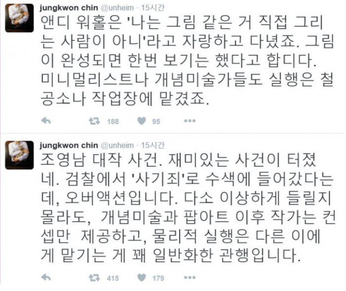 이어 "일단 원칙적으로 큰 문제는 없다. 복잡한 논의가 필요하다"면서 "그 부분은 검찰이 나설 일이 아니라 미술계에서 논쟁으로 해결할 문제라고 본다"고 꼬집었다.진중권 트위터 캡처 화면.<사진출처=진중권 트위터>