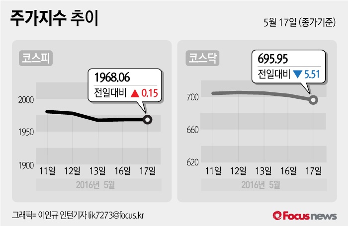 (서울=포커스뉴스) 17일 코스피지수는 전날 보다 0.01%(0.15포인트) 오른 1968.06에 장을 마쳤다. 코스닥지수는 전일 대비 0.79%(5.51포인트) 내린 695.95에 마감했다.