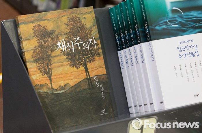(서울=포커스뉴스) 소설가 한강의 '채식주의자'가 맨부커 인터내셔널상 수상 후 판매량이 급증하고 있다. 17일 오후 서울 서초구 교보문고 강남점에서 채식주의자가 진열돼 있다.