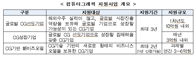 이번 사업에 선정된 기업은 기업들이 제안한 목표의 달성 여부를 토대로 연차평가를 거쳐 최대 3년간 지원받을 수 있다. 지원 규모는 글로벌 CG선도기업의 경우 1차년도 10억원 내외, CG성장기업의 경우 매년 3억원 내외다. CG기반 신비즈모델 사업은 최대 2년까지 수행할 수 있으며 지원규모는 과제별로 연간 3~6억원 수준이다.