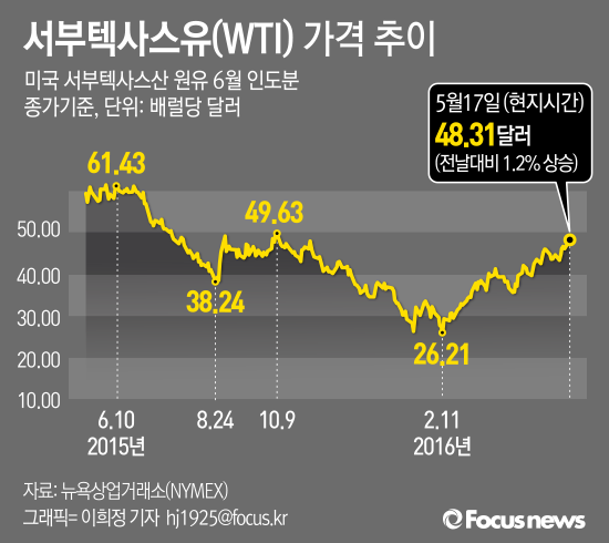 17일(현지시간) 뉴욕상업거래소(NYMEX)에서 서부텍사스산원유(WTI) 가격은 전날보다 배럴당 0.59달러(1.2%) 상승한 48.31달러를 기록했다.