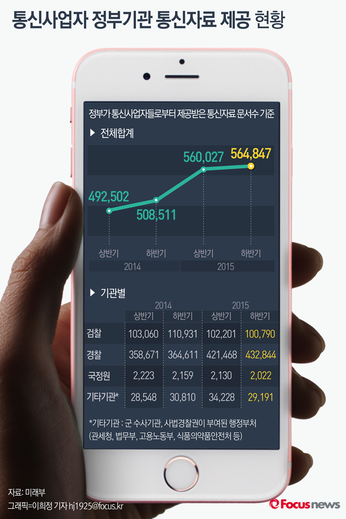 (서울=포커스뉴스) 18일 미래창조과학부에 따르면 정부가 2015년 하반기에 들여다 본 통신서비스 가입자의 개인정보가 약 56만건으로 전년 같은 기간과 비교해 11% 증가한 것으로 나타났다.