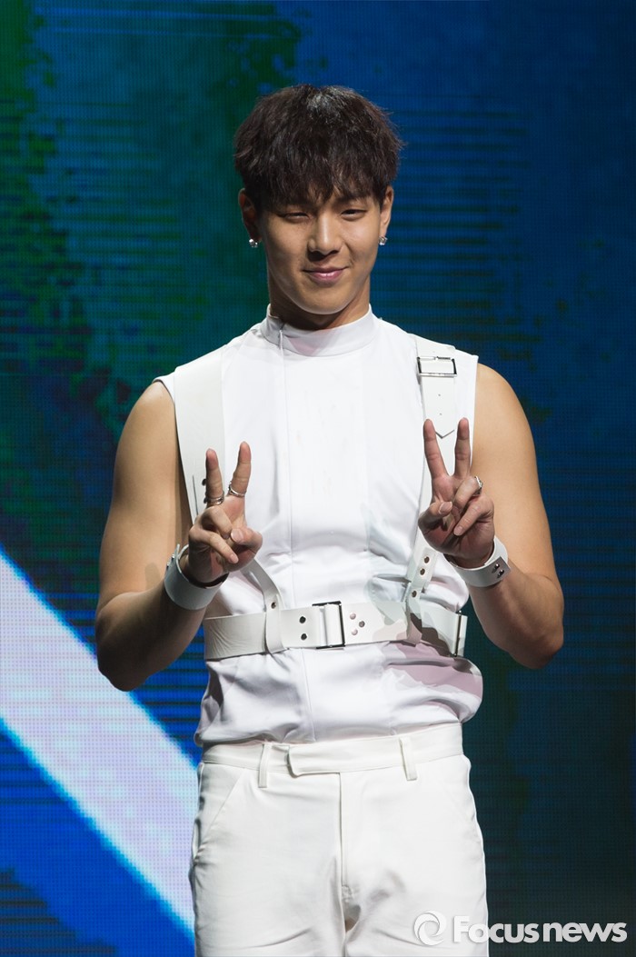 (서울=포커스뉴스) 18일 오후 서울 광진구 예스24 라이브홀에서 열린 아이돌그룹 몬스타엑스의 세번째 미니앨범 'THE CLEAN PART. 1 LOST' 발표 쇼케이스에 참석한 멤버 셔누가 포토타임을 갖고 있다.