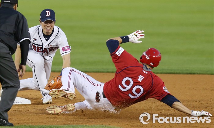 (서울=포커스뉴스) 18일 서울 잠실구장에서 열린 2016프로야구 KIA-두산 경기 4회초 무사 1루에서 KIA 필이 우중간 안타를 치고 2루까지 달리다 두산 유격수 김재호에게 태그아웃되고 있다.