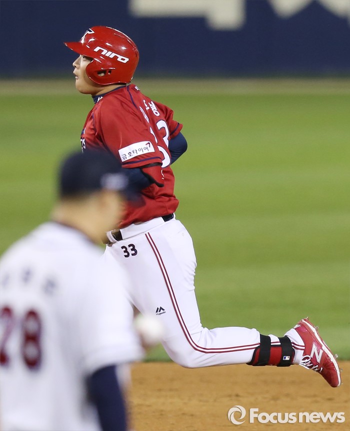 (서울=포커스뉴스) 18일 서울 잠실구장에서 열린 2016프로야구 KIA-두산 경기 5회초 무사 1루에서 KIA 김주형이 중월 2점 홈런을 치고 베이스를 돌고 있다.