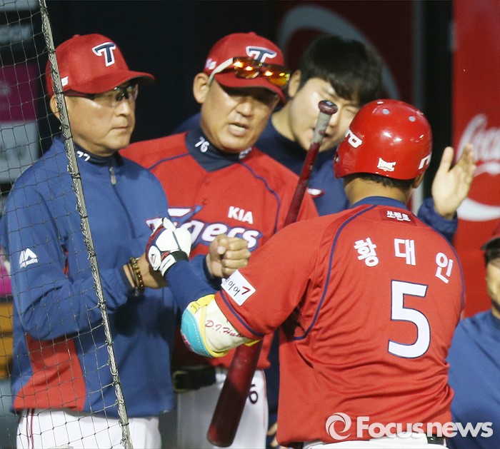 (서울=포커스뉴스) 18일 서울 잠실구장에서 열린 2016프로야구 KIA-두산 경기 5회초 KIA 황대인이 김주형에 이어 백투백으로 좌월 홈런을 치고 덕아웃에서 김기태 감독의 환영을 받고 있다.
