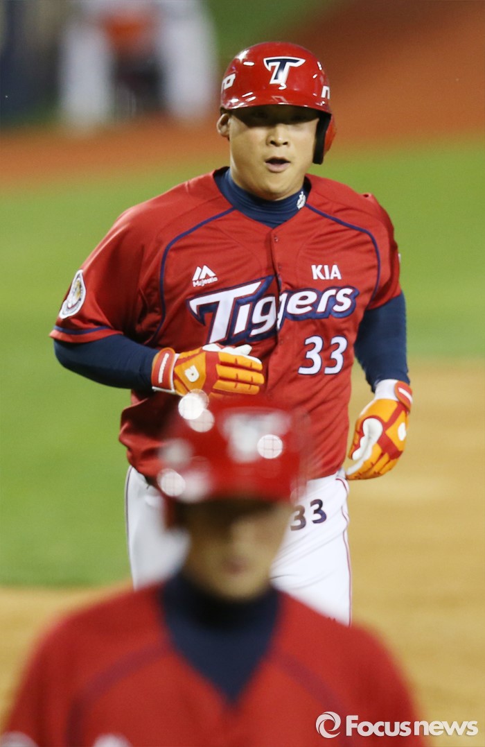 (서울=포커스뉴스) 18일 서울 잠실구장에서 열린 2016프로야구 KIA-두산 경기 5회초 무사 1루에서 KIA 김주형이 중월 2점 홈런을 치고 3루를 돌아 홈인하고 있다.